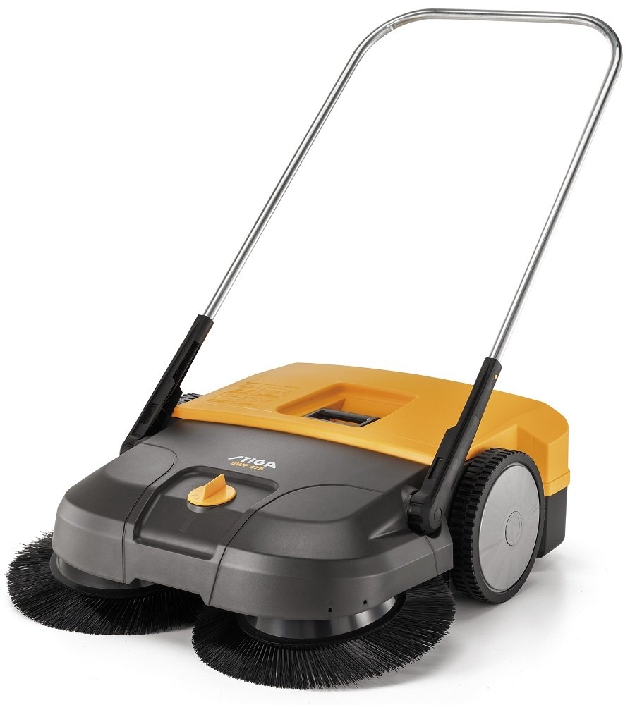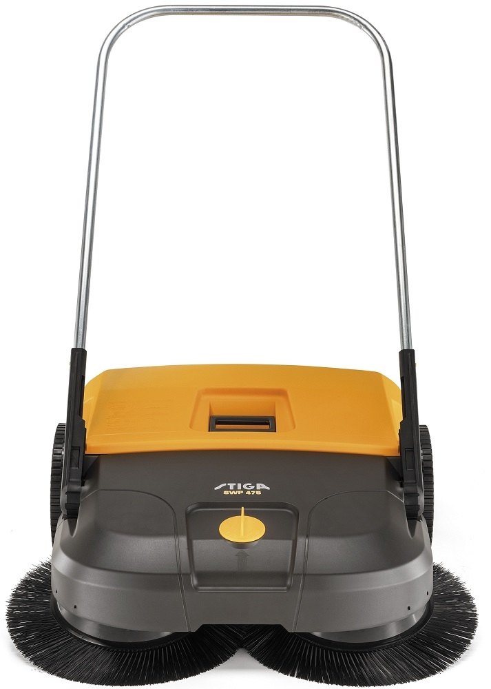 Ruční zametač Stiga SWP 475 se osmi stupni nastavení výšky, pracovním záběrem 75 cm, objemem zametací nádoby 50 l. Zametaná plocha 2900 m2/h. Průměr kartáče 400 mm.