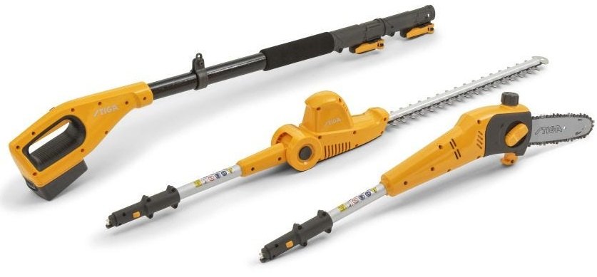Jednoduše vytáhněte 55cm teleskopickou rukojeť na potřebnou délku – s nůžkami na živý plot dosáhnete maximální výšky 2,75 m a s prořezávací pilou 2,55 m.