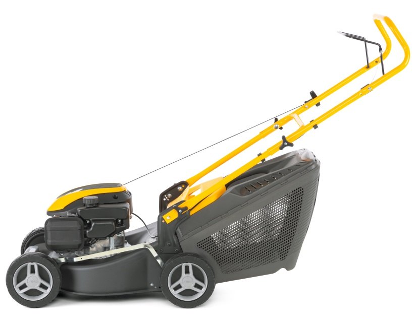 Travní sekačka bez pojezdu s benzínovým motorem o objemu 123 cm3 a 60 litrovým sběrným košem.