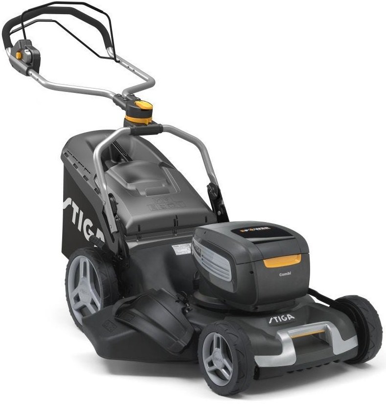 Bateriová sekačka s pojezdem STIGA Combi Combi 955e V poháněná dvěma bateriemi 48 V 7Ah. Záběr sečení 53 cm. 70 l sběrný koš. Hmotnost 37 kg.