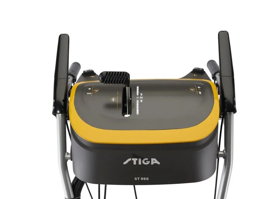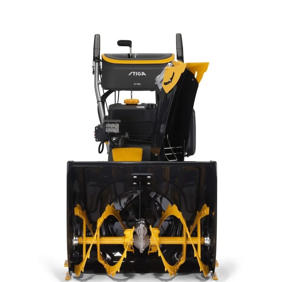 STIGA ST 966 je dvoustupňová sněhová fréza s pracovním záběrem až 66 cm a 16” velkými sněhovými koly navržená tak, aby odklízela i ty nejnáročnější vrstvy sněhu. Hydrostatická převodovka Hydrogear SST vám poskytuje extra pohodlné ovládání. Model je poháněn silným benzínovým motorem STIGA WS 300 o objemu 302 ccm. Všechny ovládací prvky jsou pohodlně umístěny na středovém panelu. Komfortní elektrické startování vám umožní nastartovat při jakékoli teplotě až do -30 °C. Díky vyhřívanému madlu, které se aktivuje tlačítkem na palubní desce, vám ST 966 umožní provádět nepřetržitou práci i při velmi nízkých teplotách. Díky inovovanému systému a výkonnému ocelovému šneku s pilovými zuby dokáže vyhazovat sníh do vzdálenosti až 15 metrů. Viditelnost je zajištěna výkonným a nastavitelným LED světlem, díky němuž lze pracovat i ve zhoršených světelných podmínkách.