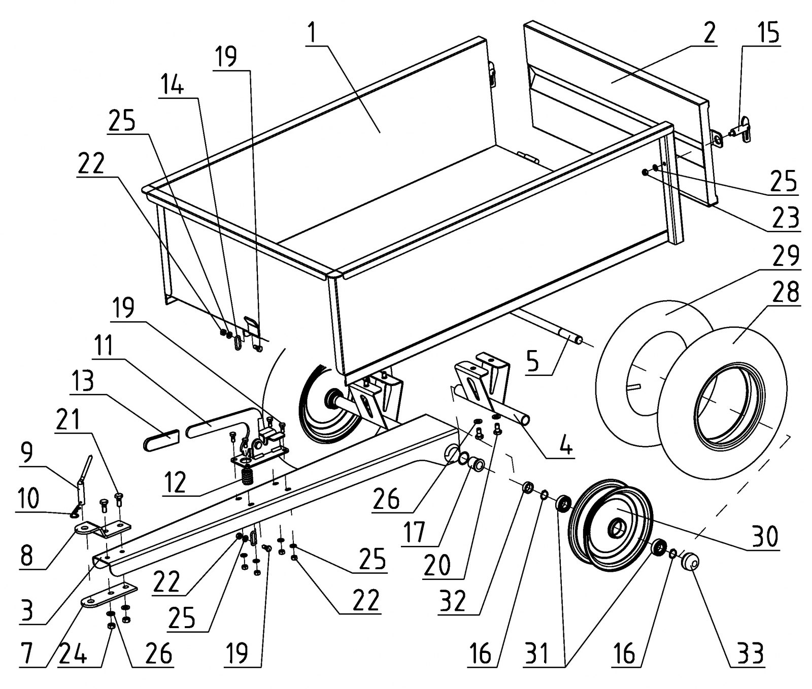 Všechny typy mají sklápěcí korbu, která je zajištěna jednoduchým mechanismem, otevíratelné i odnímatelné zadní čelo. Vozíky jsou lakované práškovou barvou.